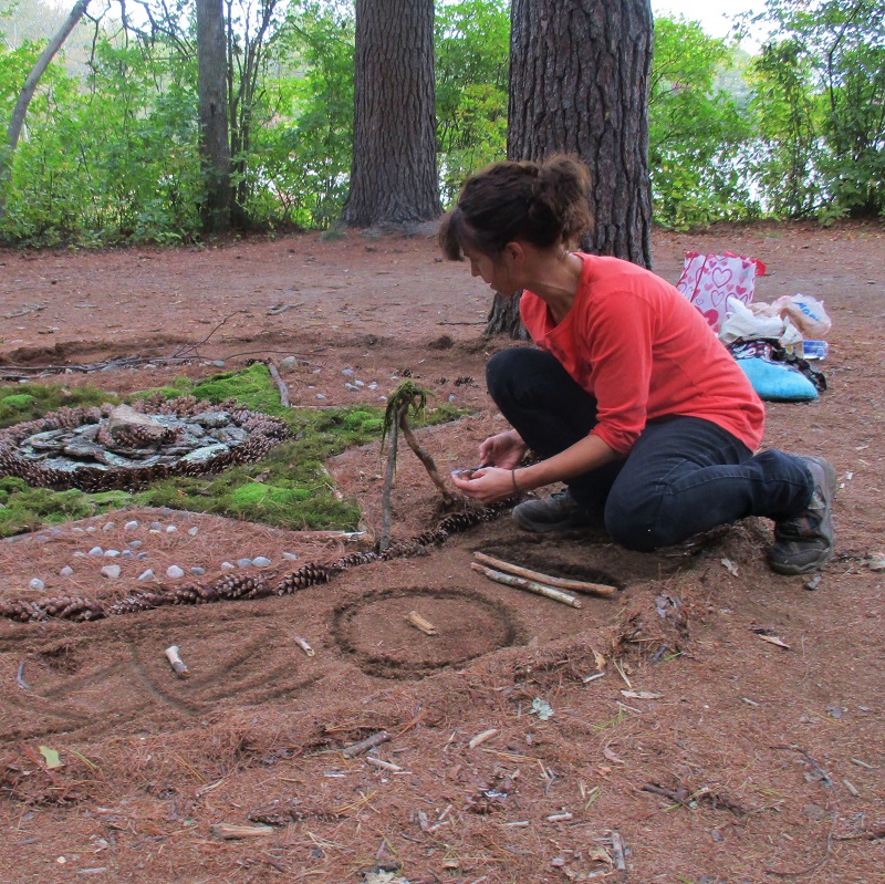 could be used from floor to ceiling. The show’s theme was “Bringing the Outside In.” Below are photos of her award-winning room.Patricia’s proposal called for a nature celebration incorporating sacred geometry created from foraged items from the New England woods. She was assigned the house’s library. With a few adjustments she brought the celebration indoors as “The Final Soiree” of the house at the Governor Ames Estate. She tipped the hat to the former residents with tongue in cheek fun elements; a portrait of clover and beech leaves over the mantel, a piano player with sheet music from the 1890s, a statue of one of the Ames women and period stencils which added to the sacred geometry of the room. The focal wall treatment was paint and pine needles. Deliciously aromatic mugwort graced the top shelves of all the bookcases and nature and wind chime sounds filled the room. The seed pods and glass heart window curtains seemed to move and “bling” together in the breeze. The multi-sensory experience tickled eyes, ears, nose and brain.